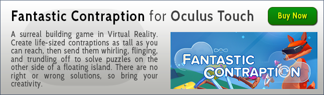 Fantastic Contraption was a launch title bundled with the HTC Vive and is also available for Oculus Touch and PS VR. Download screenshots and more at our presskit or contact us at FantasticContraption@gmail.com.